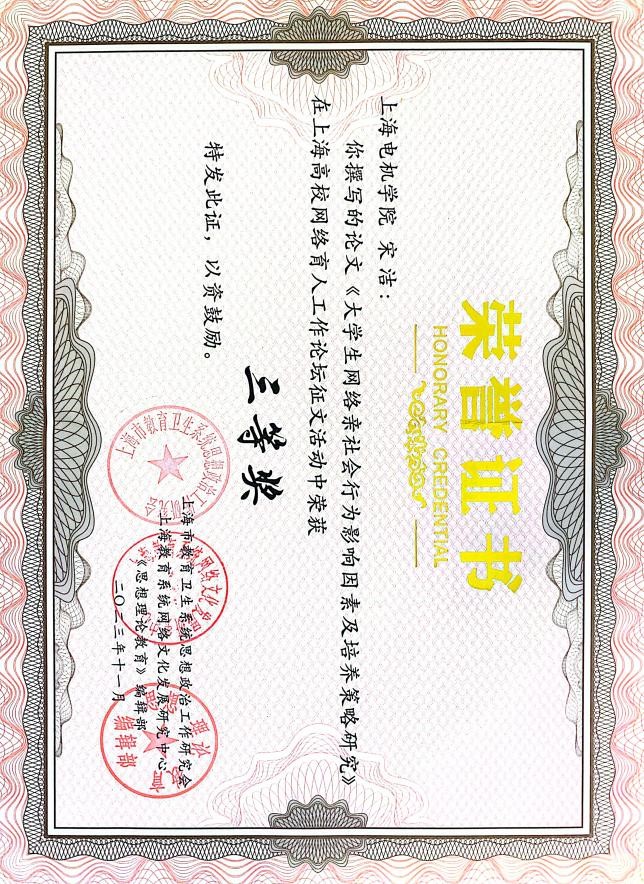 近日,万象城宋洁老师在上海高校网络育人工作论坛征文中,以题为《大学生网络亲社会行为影响因素及培养策略研究》一文,喜获三等奖!