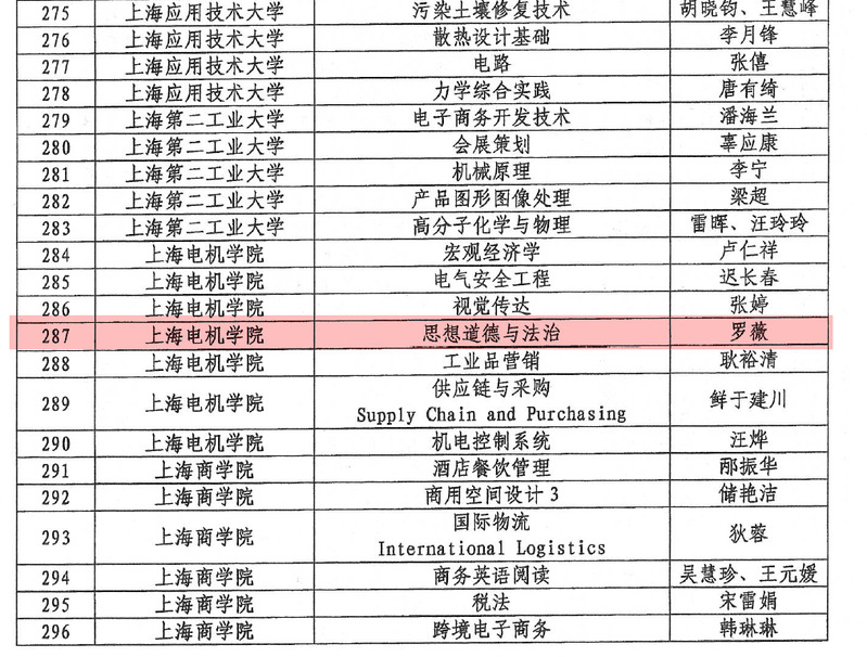 近日,上海市教育委员会公布了2024年度上海高校市级一流本科课程认定结果,万象城罗薇教师负责的《思想道德与法治》课程成功入选。这是罗薇老师继2017年作为该课程负责人获评上海市重点课程后,经过六年精心建设取得的又一重要成果。